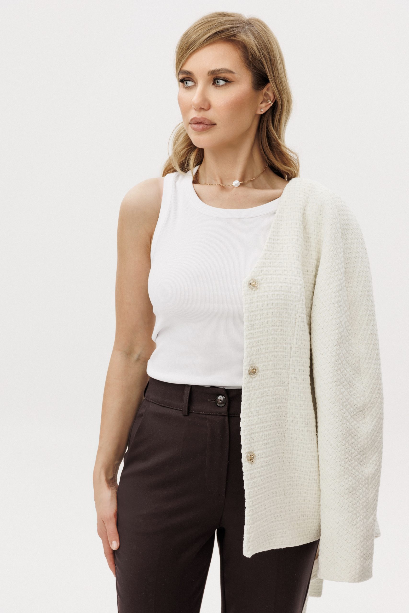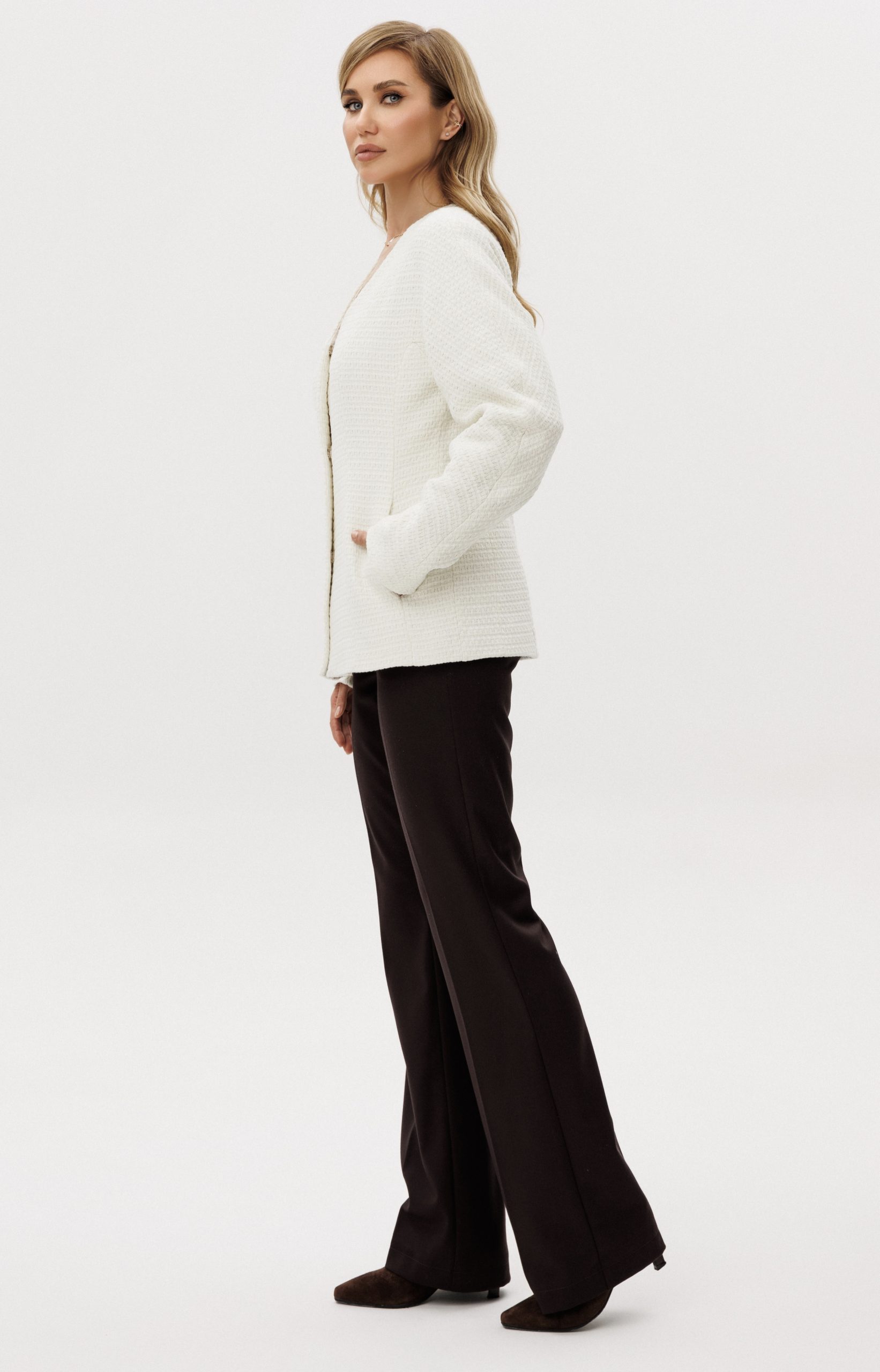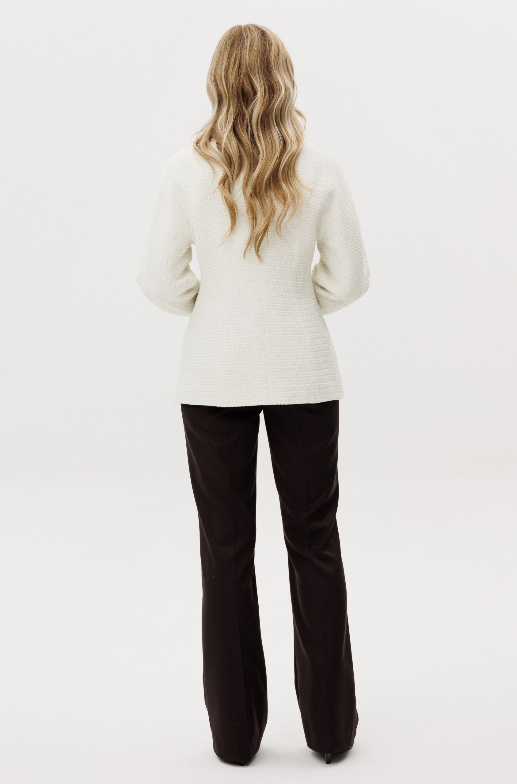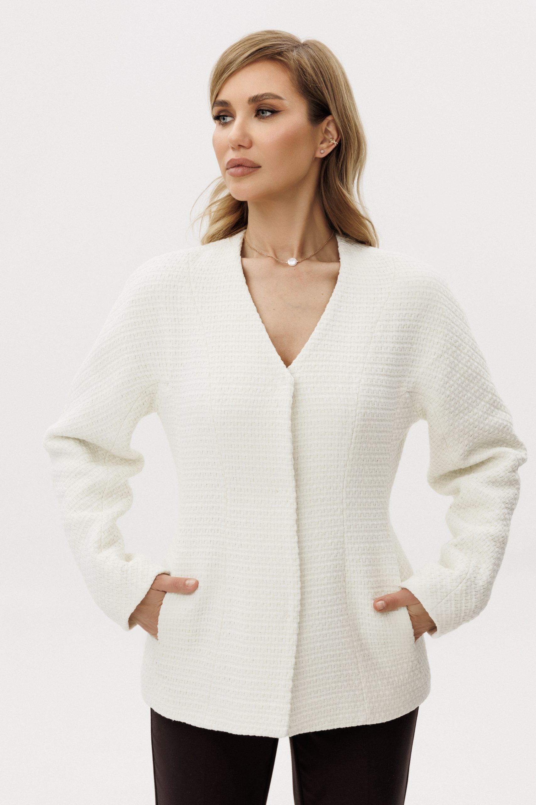 Жакет приталенного силуэта из мягкого твида на вискозной основе — структурная модель с акцентом на линию фигуры. Фигурные рукава и аккуратные плечи формируют собранный, но пластичный образ. Боковые карманы встроены в конструкцию, не нарушая чистоту посадки. Вшивные декоративные кнопки из смолы и золотого металла — визуальный акцент, встроенный в функциональную линию. Подкладка из смесовой вискозы обеспечивает комфорт и стабильность формы. Модель подходит для деловых и повседневных образов, легко сочетается с брюками, юбками и платьями.