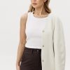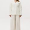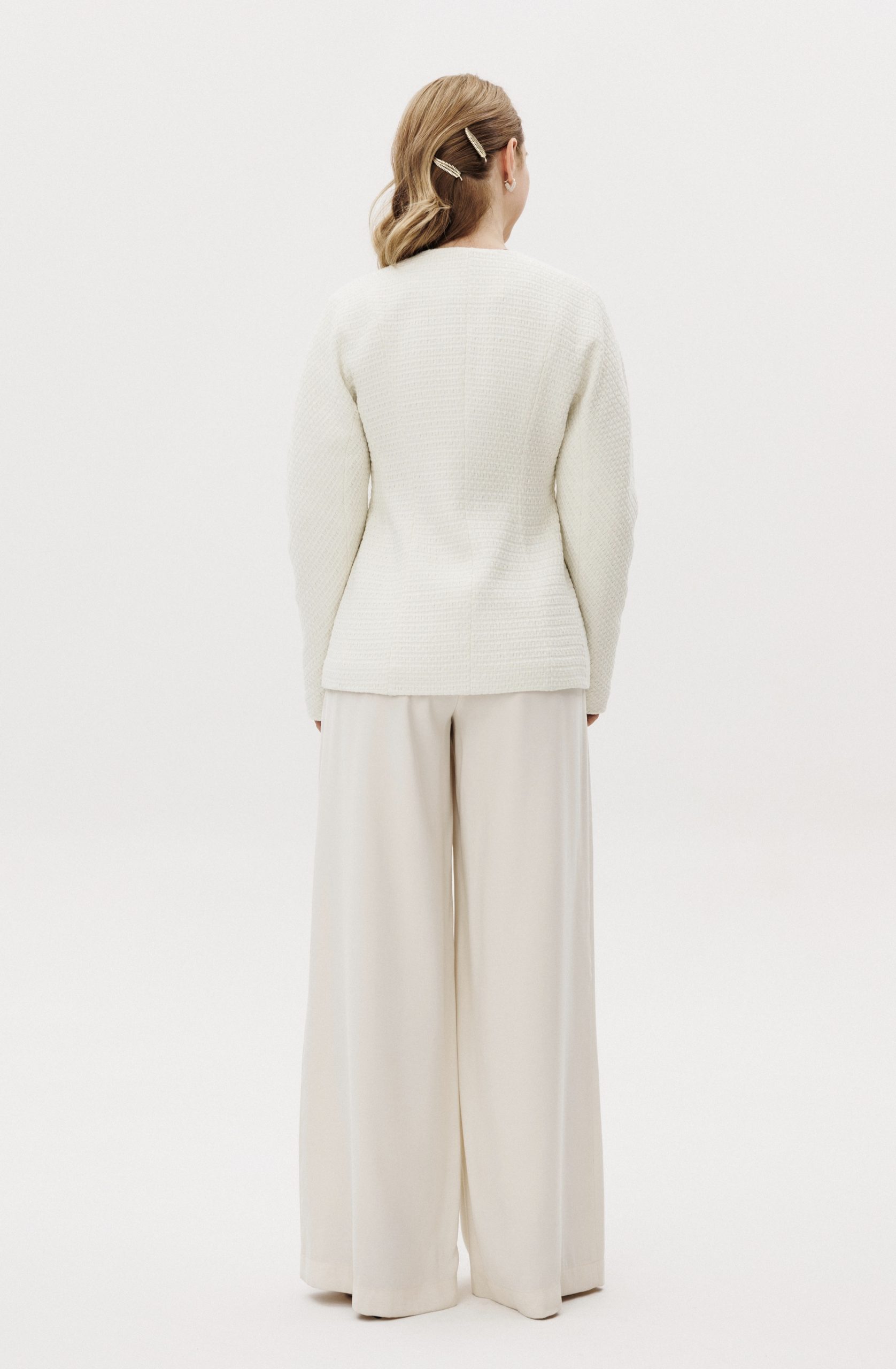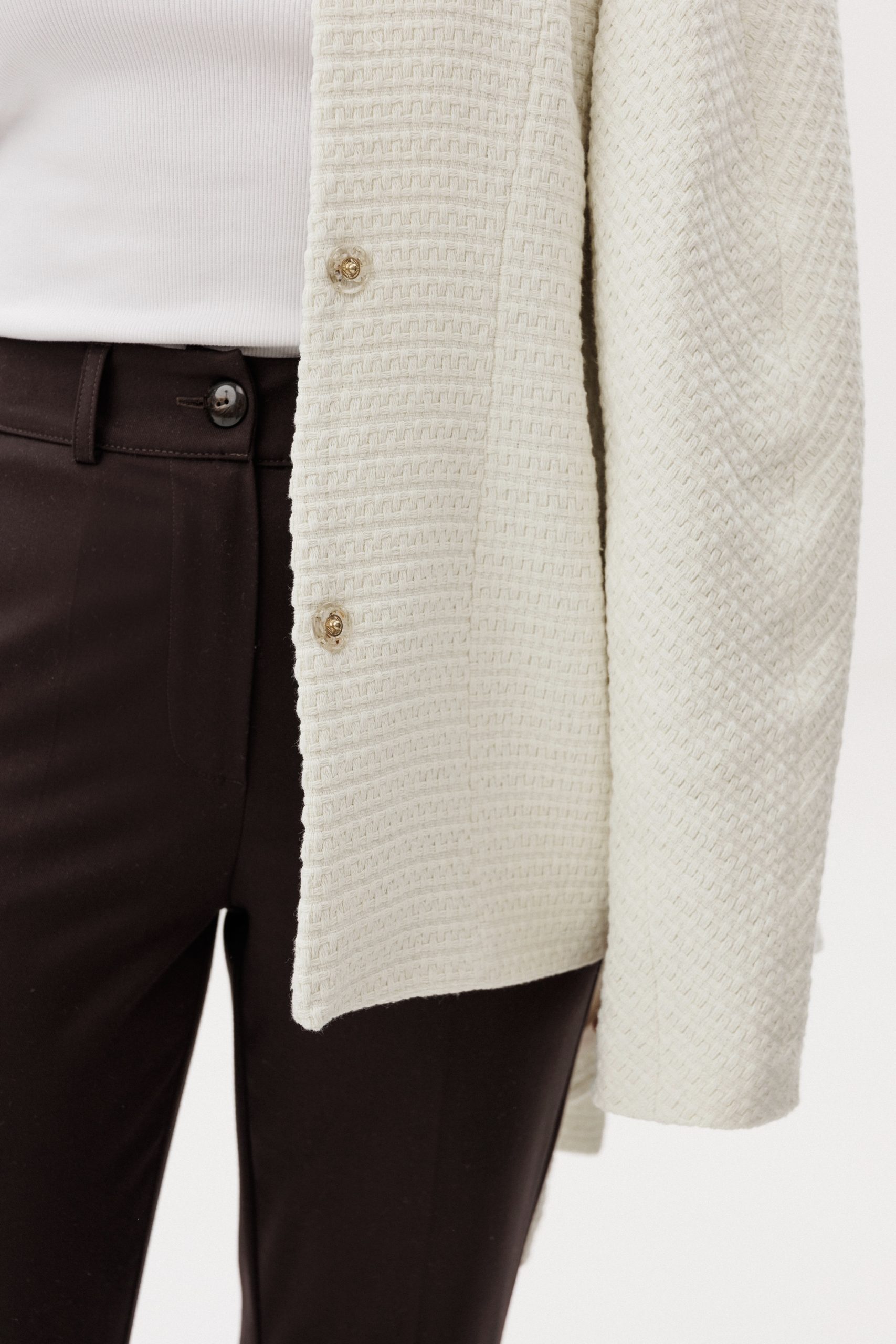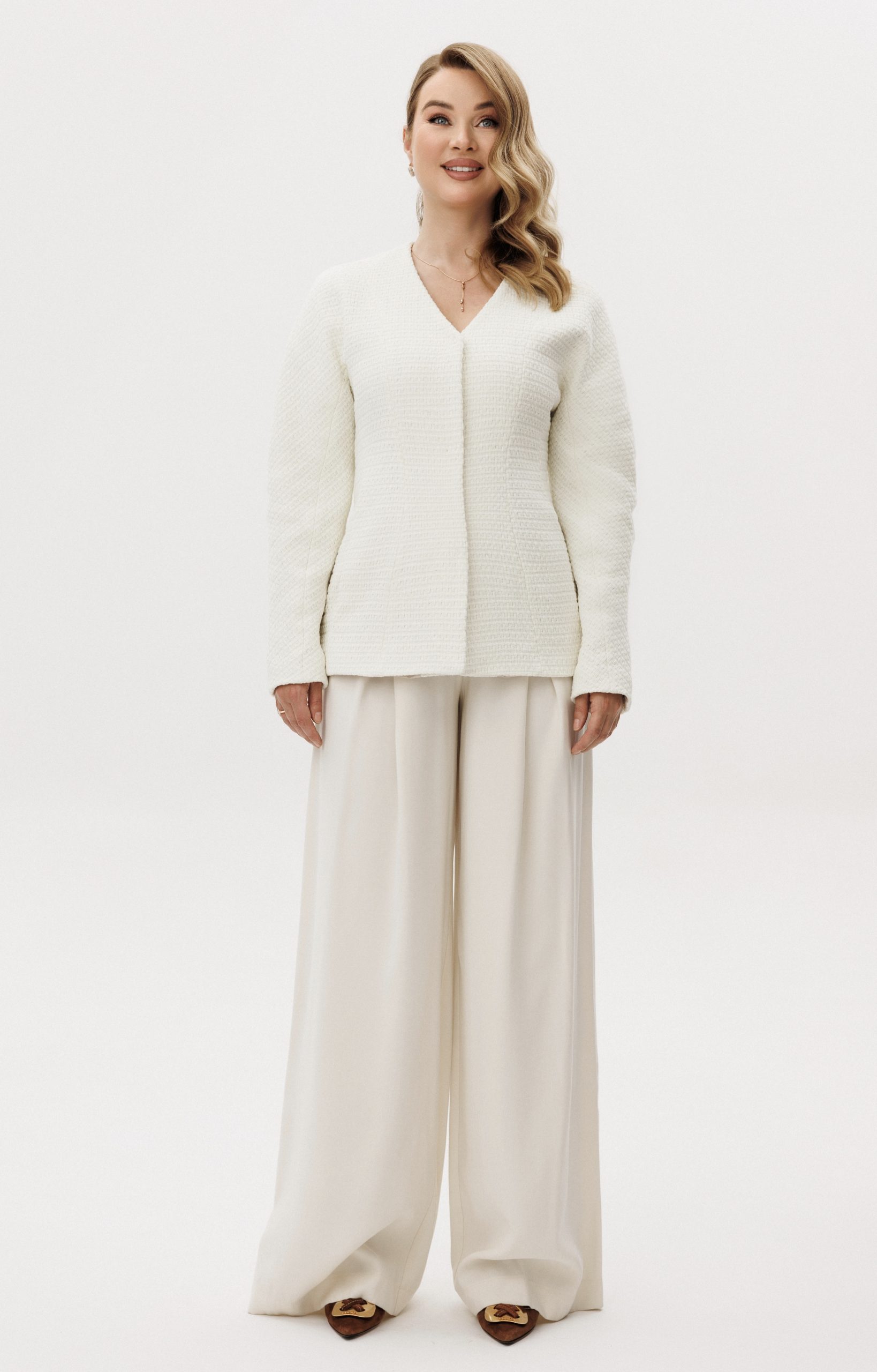 Жакет приталенного силуэта из мягкого твида на вискозной основе — структурная модель с акцентом на линию фигуры. Фигурные рукава и аккуратные плечи формируют собранный, но пластичный образ. Боковые карманы встроены в конструкцию, не нарушая чистоту посадки. Вшивные декоративные кнопки из смолы и золотого металла — визуальный акцент, встроенный в функциональную линию. Подкладка из смесовой вискозы обеспечивает комфорт и стабильность формы. Модель подходит для деловых и повседневных образов, легко сочетается с брюками, юбками и платьями.