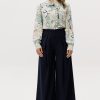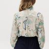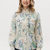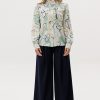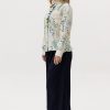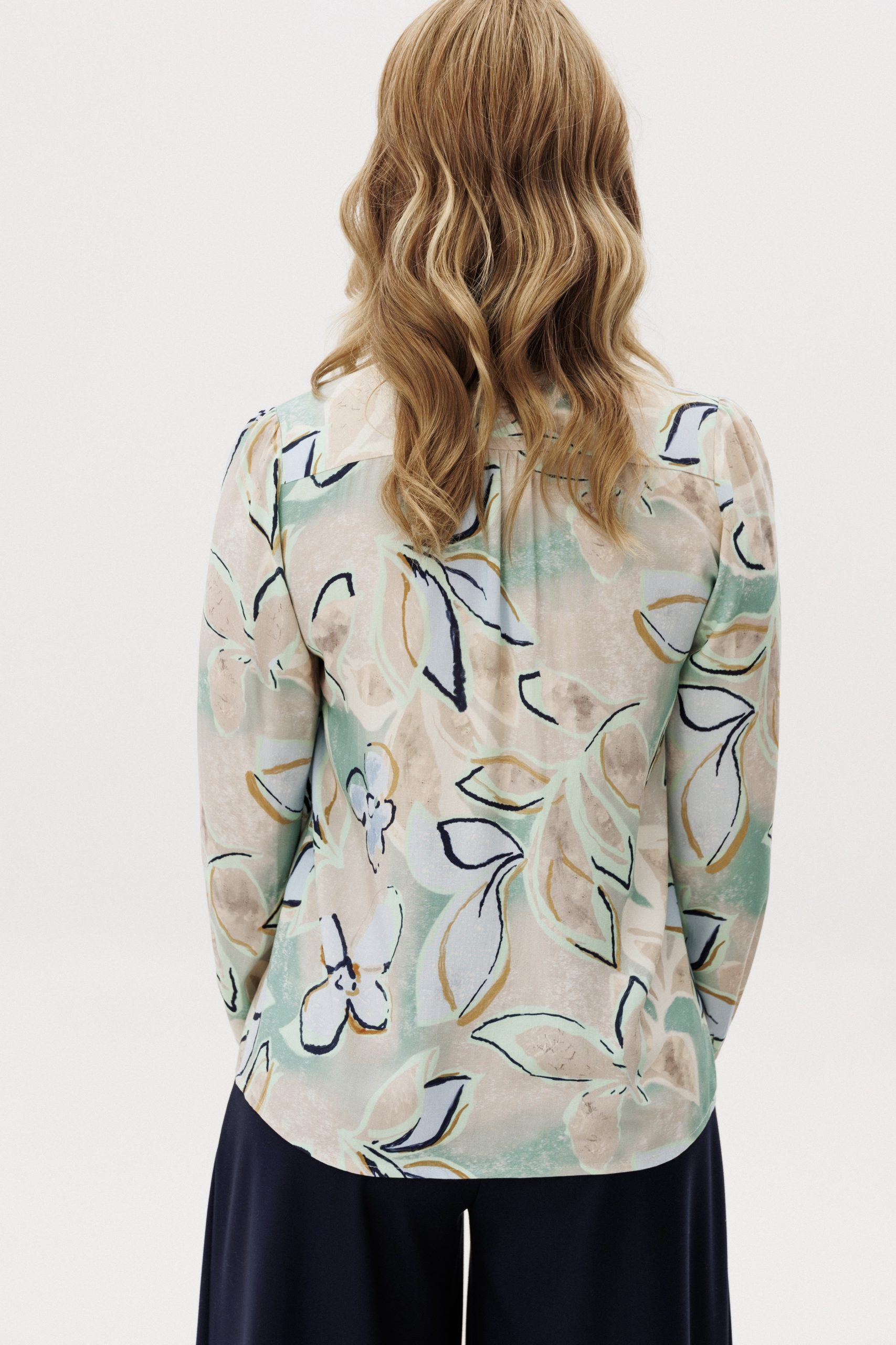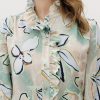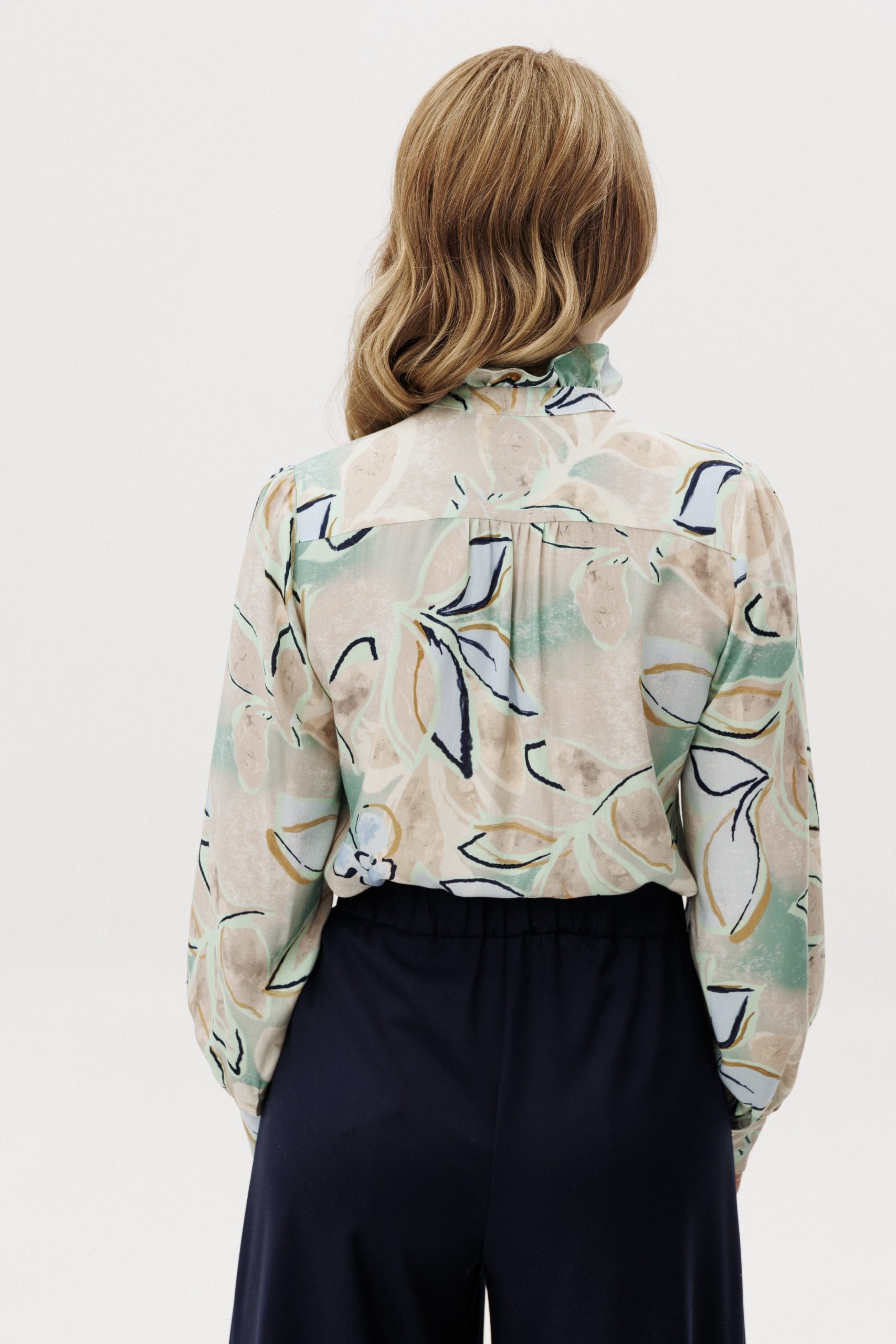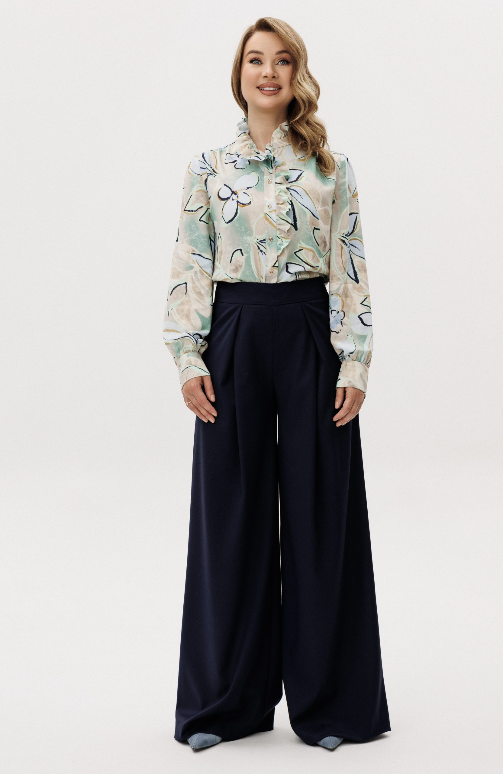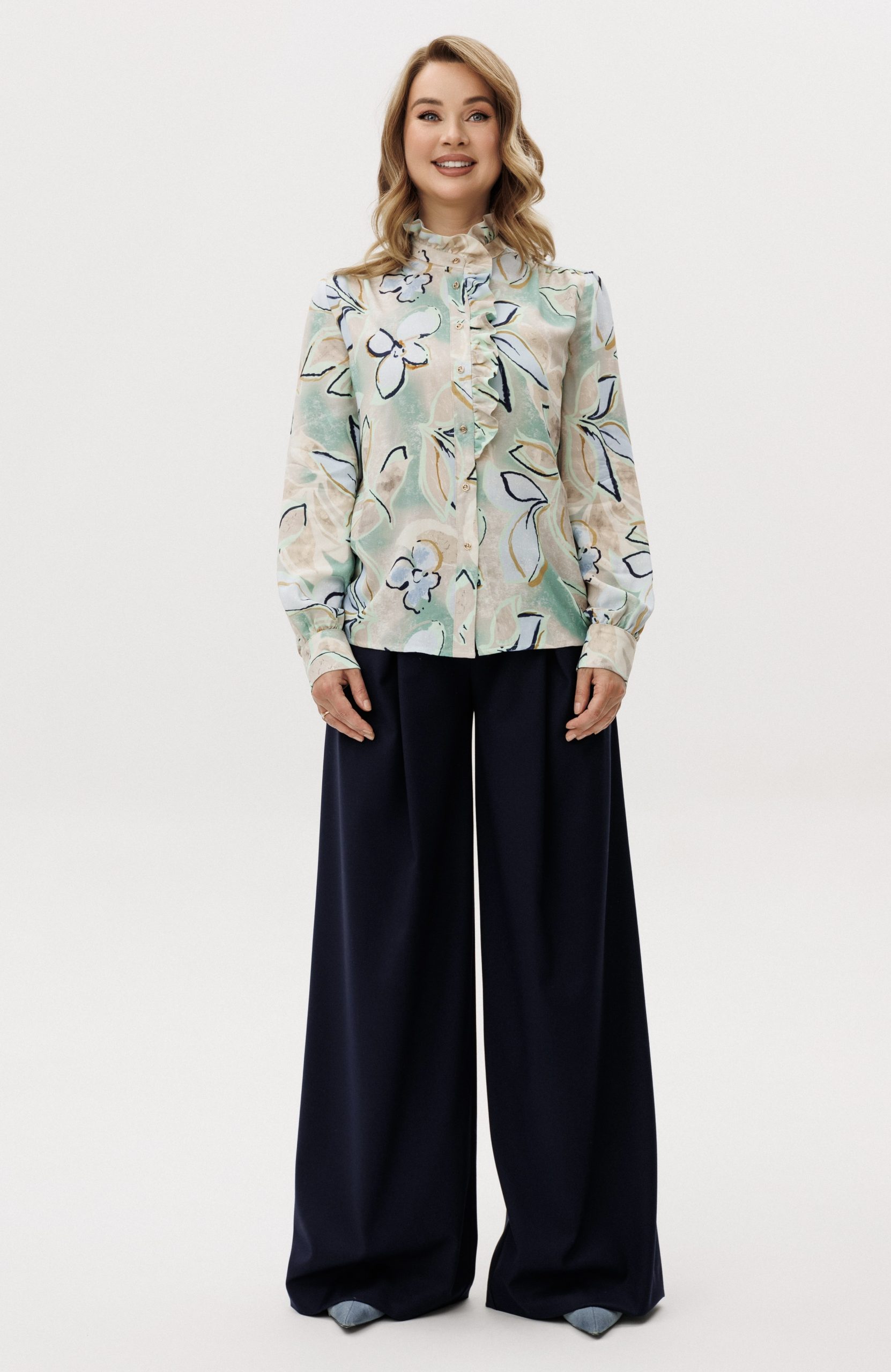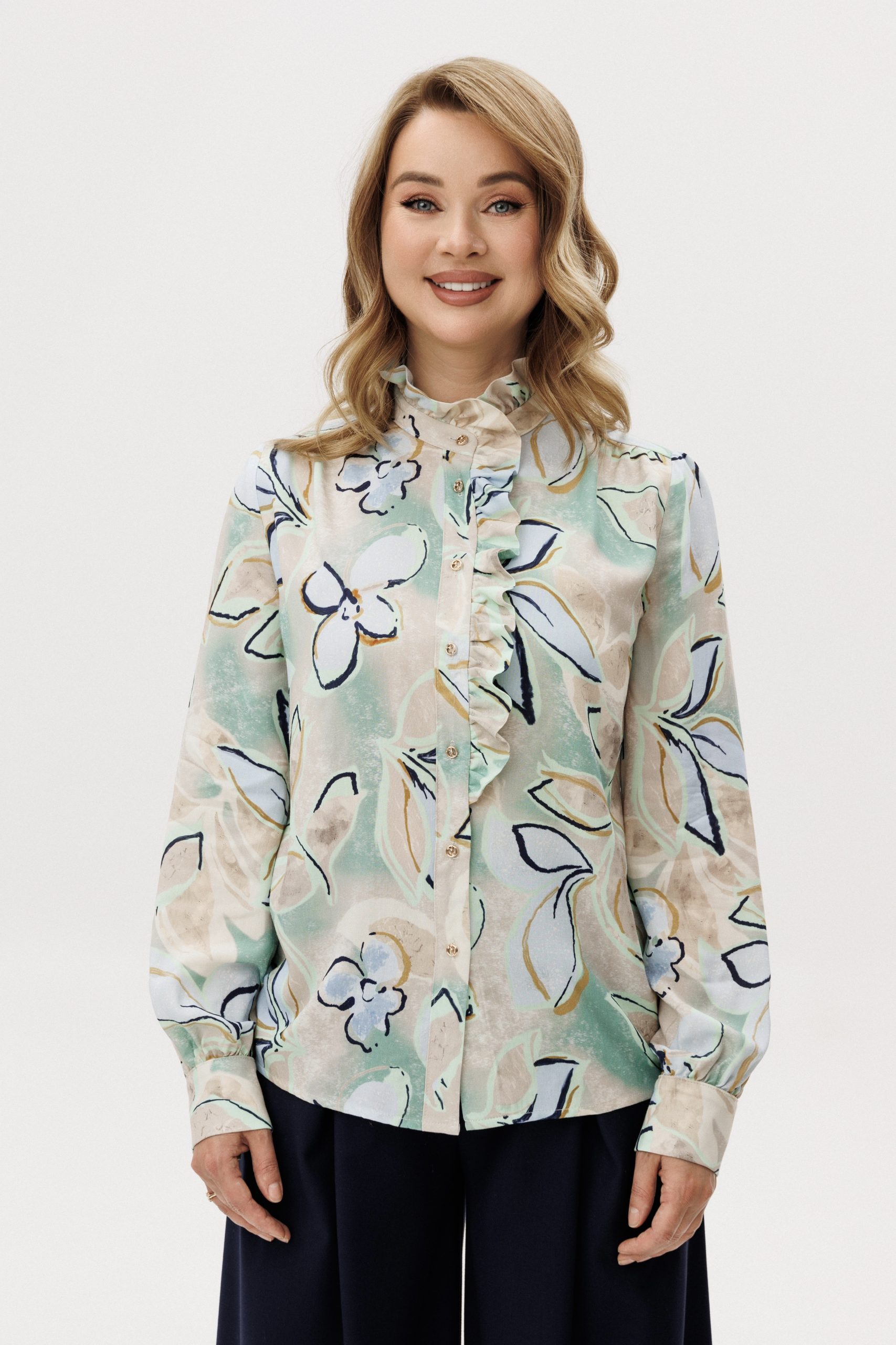 Рубашка прямого кроя из струящейся вискозы — лёгкая модель с акцентом на детали. Рюши вдоль планки и горловины формируют мягкий вертикальный ритм, добавляя образу выразительности. Металлические пуговицы со стразами — декоративный элемент, встроенный в конструкцию, без излишней нарядности. Ткань комфортна в носке, хорошо драпируется и подходит для многослойных сочетаний.